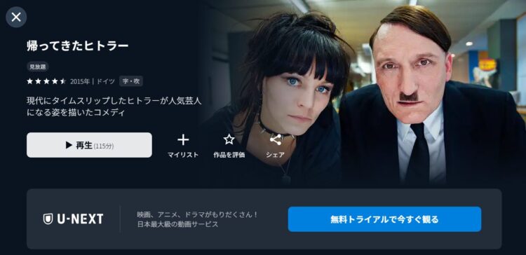 無料トライアル期間の31日間で、「帰ってきたヒトラー」に加えて、気になっていた他の映画やドラマをまとめて視聴するのがおすすめです。U-NEXTは見放題作品数が業界最多クラスなので、1ヶ月あれば十分に元を取れます。
