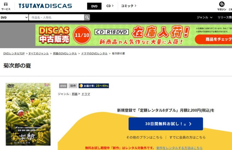 「菊次郎の夏」を視聴できる唯一の方法は、TSUTAYA DISCASの宅配DVDレンタルです。